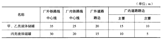 根据《建筑设计防火规范》第4.2.9条规定,甲、乙、丙类液体储罐与铁路、道路的防火间距不应小于表4.2.9(见下表)的规定。