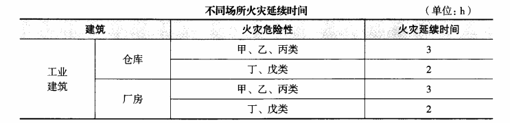 根据该规范第3.6.2条,不同场所消火栓系统和固定冷却水系统的火灾延续时间不应小于下表的规定。