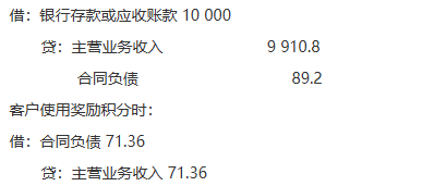 答案解析: 2022年度授予奖励积分构成单项履约义务,其公允价值=10000×0.01×90%=90(万元),2022年度因销售商品构成单项履约义务,其公允价值=10000(万元);按照新的会计准则,合同价款10000万元需要根据这两项单项履约义务进行分摊,分摊至产品的金额为=10000×10000/(10000+90)=9910.80(万元),分摊至奖励积分的金额为=10000×90/(10000+90)=89.2(万元),因2022年度因客户使用奖励积分7200万分,占估计使用9000万分的80%,所以2022年确认奖励积分收入71.36(89.2×80%)(万元),2022年确认商品销售收入和奖励积分使用收入共9982.16(9910.8+71.36)(万元),会计分录: