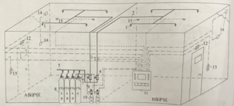 答案解析: 图中数字所代表的含义具体如下1-喷嘴;2-管道;3-压力信号器;4-选择阀;5-集流管;6-容器阀;7-单向阀;8-储存容器;9-启动装置:10氮气瓶;11-火灾报警控制器;12-放气指示灯:13-紧急启停按钮;14-声光报警器;15-火灾探测器。