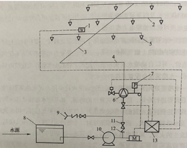 答案解析: 图中各数字所代表的含义具体如下1-感温探测器;2-配水支管;3-配水管;4-配水干管;5-开式喷头;6-雨淋报警阀;7-压カ开关;8-消防水池9-水泵接合器;10-水泵;11闸阀12-止回阀;13-报警控制器;P-压力表;M-驱动电动机。