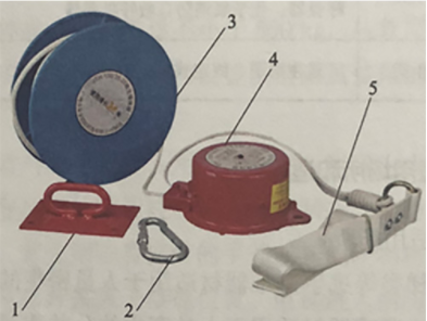 答案解析: 图中各数字所代表的含义具体如下: 1墙面固定栓; 2一安全钩; 3一绳索卷盘; 4一调速器; 5一安全带