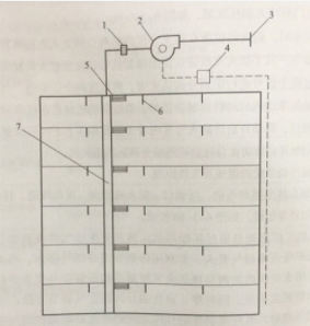 答案解析: 图中数字所代表的含义具体如下: 1-防火排烟阀; 2-排烟风机; 3-排烟出ロ; 4-控制器; 5-排烟口; 6-挡烟垂壁; 7-排烟风道。