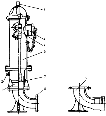 答案解析: 1—阀体;2—排水阀;3—阀杆;4—65mm出水口;5—100mm出水口;6—本体;7—阀座;8—法兰弯座;9—承插弯座。