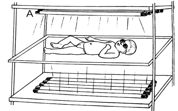 单选题 患儿,生后3天,因皮肤黄染严重来院治疗,测定血清胆红素235μmol/L,遵医嘱进行治疗。治疗方式如图所示,A点为热源(或光源),该种治疗方法是()。