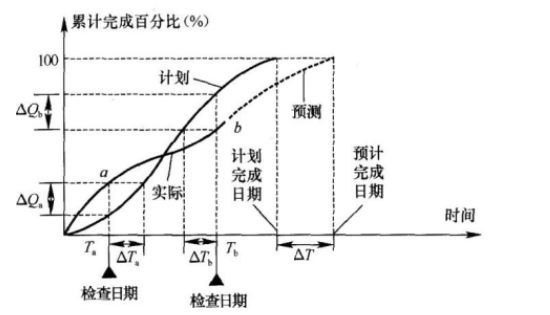 答案解析: 本题考核的是利用S曲线比较实际进度与计划进度。在S曲线比较图中可以直接读出工程项目实际进度比计划进度超前或拖后的时间。如下图所示。 △Ta表示Ta时刻实际进度超前的时间;△Tb表示Tb时刻实际进度拖后的时间。△Qa表示Ta时刻超额完成的任务量,△Qb表示Tb时刻拖欠的任务量。