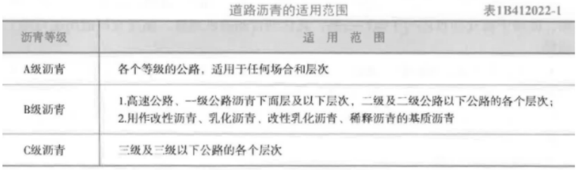 答案解析: A级沥青:各个等级的公路,适用于任何场合和层次。 B级沥青: 1.高速公路,一级公路沥青下面层及以下层次,二级及二级公路以下公路的各个层次; 2.用作改性沥青,乳化沥青,改性乳化沥青,稀释沥青的基质沥青。 C级沥青:三级及三级以下公路的各个层次。 考点来源:道路石油沥青