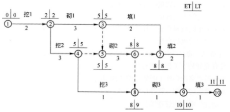 答案解析: 关键线路两条分别是①②③⑤⑥⑦⑨⑩,①②④⑤⑥⑦⑨⑩。而③⑦填1不是关键工序,所以不是3条。