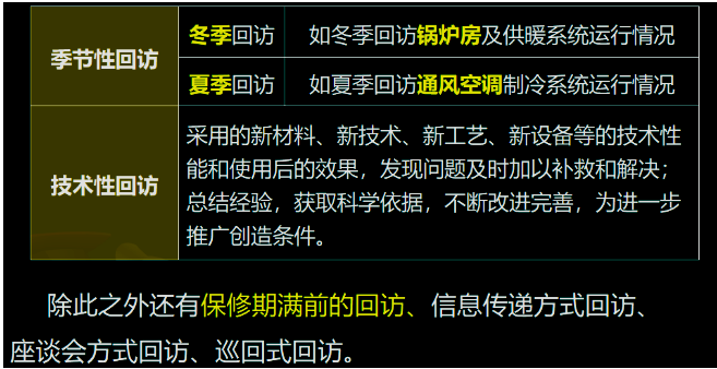 B.冬季回访,如冬季回访锅炉房及供暖系统运行情况