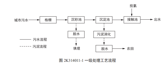 答案解析: 一级处理工艺流程如图2K314011—1所示。主要针对水中悬浮物质,常采用 物理的方法,经过一级处理后,污水悬浮物去除可达40%左右,附着于悬浮物的有机物也 可去除30%左右。