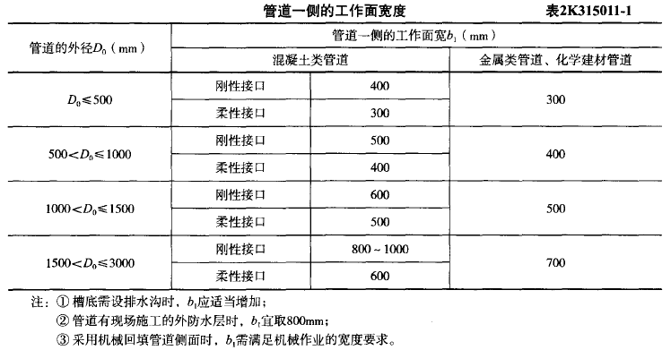 B=D0+2×(b1+b2+b3),D0是管外径,b1是管道一侧的工作面宽度,b2是有支撑要求时,管道一侧的支撑厚度,b3是现场浇筑混凝土或钢筋混凝土管渠一侧模板厚度。