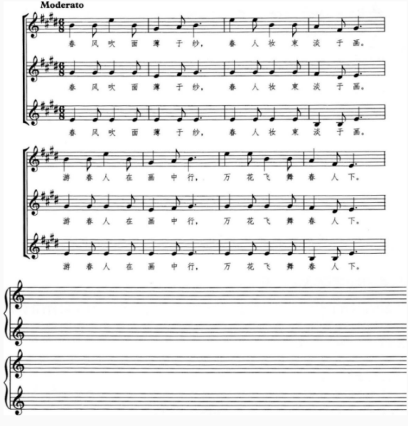 下面谱例是三声部合唱《春游》的片段,请按照要求将其改编。