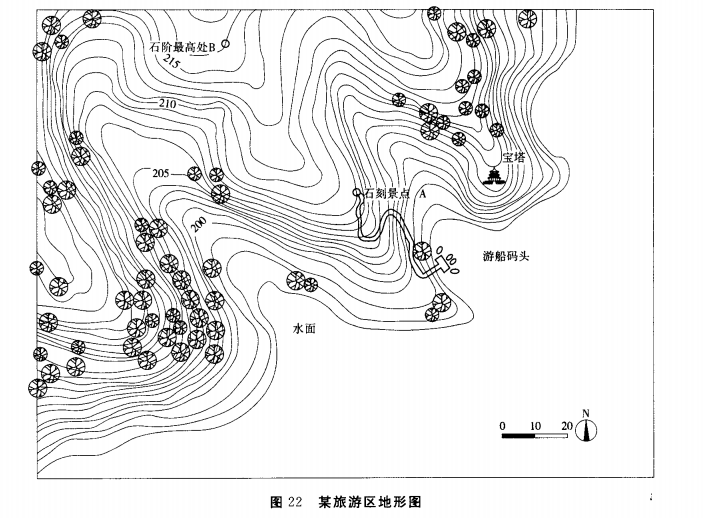 某旅游区临水山地地形见图22,场地内有树高12m的高大乔木群、20m高的宝塔、游船码头、登山石阶及石刻景点。