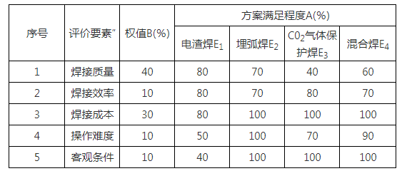 某机电安装公司承建了一植物油厂的锅炉机电安装工程,为保证质量、加快进度、降低成本,材料由建设单位提供,该公司项目部组织有关技术人员进行施工方案设计,为了选择确定能保证焊接质量的焊接方法,已初选出电渣焊、埋弧焊、CO2气体保护焊、混合焊四个焊接方案。根据调查资料和本公司实践经验,已定出各评价要素的权重及方案的评分值,见下表。施工中出现如下事件: