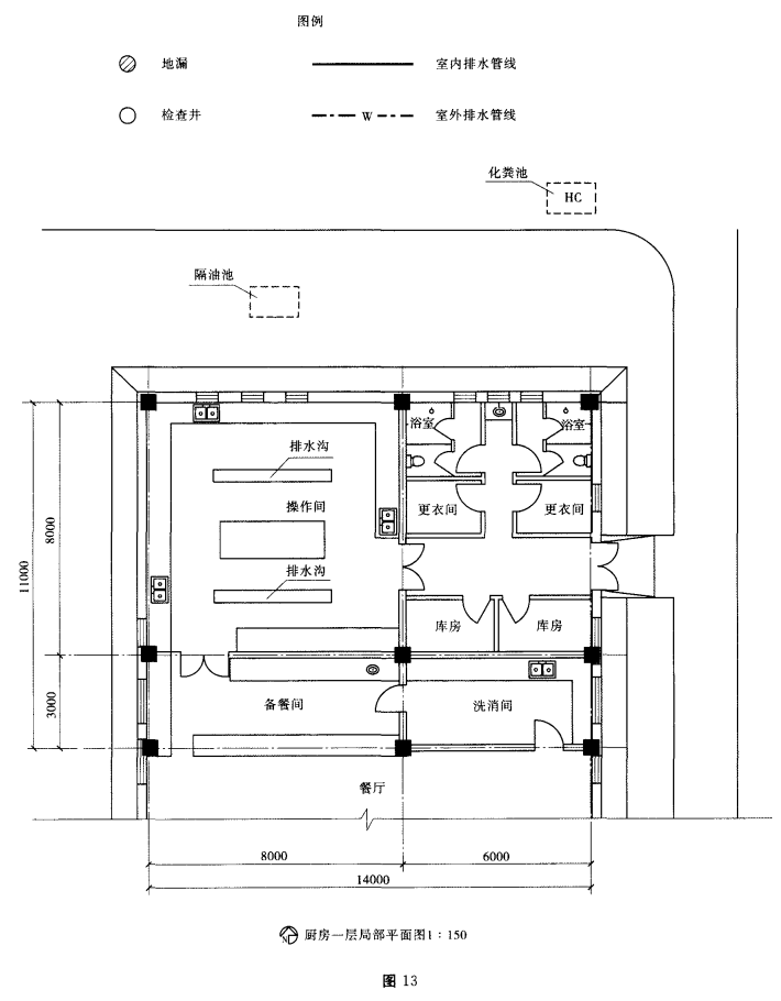 某快餐厅厨房一层局部平面及场地见图13,场地中已给出隔油池和化粪池位置,室外排水
