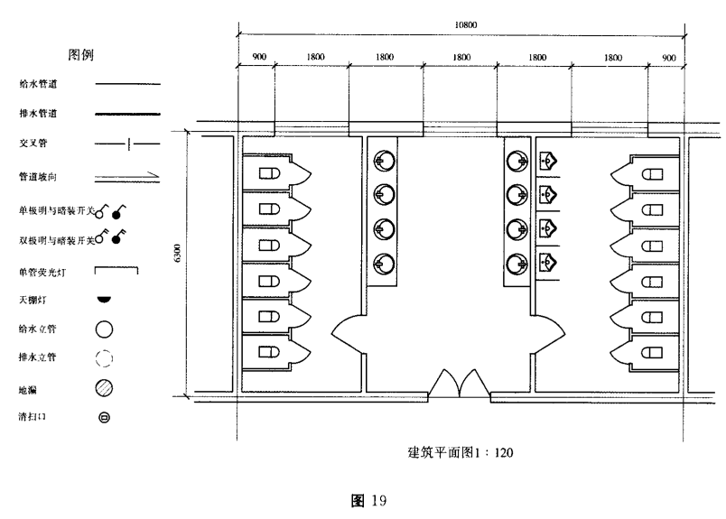 某学校宿舍盥洗室及卫生间平面如图19所示,根据建筑物用途,在图上用图例所示符号分别绘出给水、排水立管和水平管布置图、室内灯具照明图、开关位置、线路布置图。