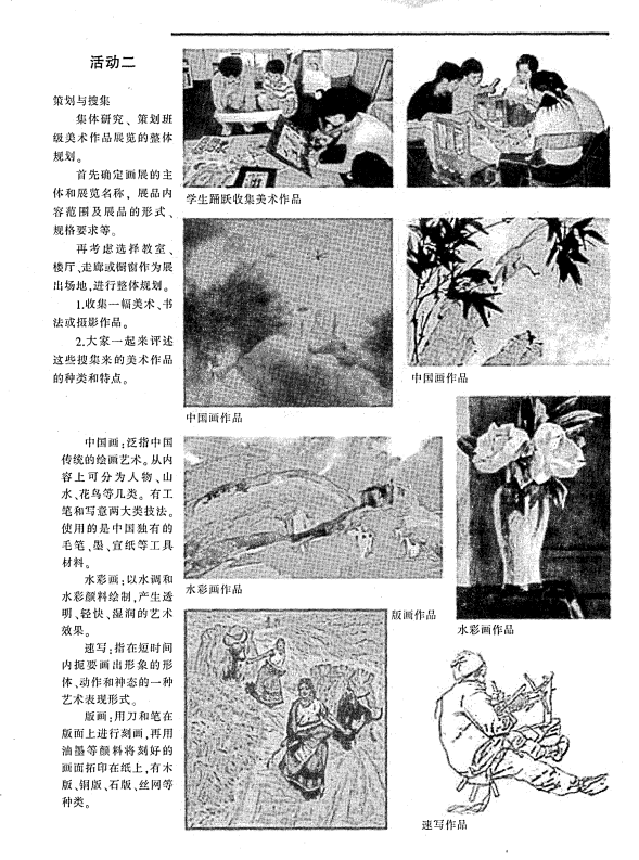 张老师在《过去的日子》一课教学时,将“开展欣赏表现过去生活的艺术作品和‘看过去,讲过去’的活动,指导学生‘画过去’”设为教学重点。上课时,在导入环节,首先利用多媒体播放怀旧校园歌曲《光阴的故事》(以且flash动画形式播放),一曲老歌,水彩风景画的不断播放,把学生带入了主题——过去的日子。第二个环节教师展示收集的摄影照片(关于儿童玩游戏的各种照片,勾起学生的回忆)。这时就有同学想到自己的童年,已经过去的难忘的日子(同学互相交流)。第三个环节欣赏儿童作品,从欣赏到观察、从观察到研究,这个环节使同学们从构图到色彩对儿童创作画有了一定的认识。在小结后,布置下节课主题——童年的日子(创作一幅儿童画)。