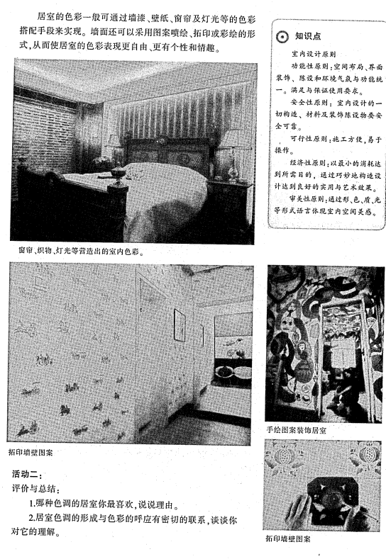 李老师在《了解纹样》一课教学时,身着少数民族服装进屋,让学生观察自己身着的少数民族服装上有规律的纹样,引导学生去了解纹样是如何设计的,从而导入课程。李老师询问学生,纹样色彩搭配是由什么要素决定的?从而得出色相、明度和纯度,再利用多媒体展示三张图,让学生自主讨论,通过对每幅图中运用颜色的不同、颜色明度、颜色纯度的分析。老师又在黑板上绘制出简单纹样并总结,可以把纹样的颜色搭配形式分为同一色、类似色、对比色三种,同时了解纹样的设计特点。