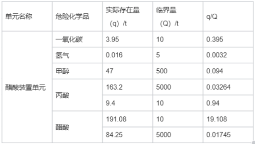 现有公用工程。醋酸生产工艺采用低压甲醇液相羰基合成技术,使用碘-铑体系催化剂,甲醇和一氧化碳在190℃、2.9MPa及催化剂条件下反应生成醋酸。原料一氧化碳和甲醇由该企业自供。该项目选址及平面布局执行《煤化工工程设计防火标准》(GB51428)。该项目建成后企业开展了“三查四定”,所提出的问题已整改完成。装置试生产期间运行稳定,采用的技术、工艺和设备设施安全、可靠。目前该建设项目进入安全验收阶段,委托安全评价机构开展安全验收评价工作。安全评价机构收集了如下资料:概况、设计依据、设计文件、生产系统及辅助系统生产及安全说明、安全设施设计专篇和危险有害因素分析所需资料和安全技术与安全管理措施资料核实了安全设施设计内容的落实情况:进行了危险化学品重大危险源辨识情况的复核,复核结果如下