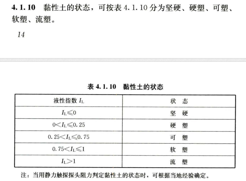 答案解析: 4.1.10黏性土的状态,可按表4.1.10分为坚硬、硬塑、可塑、软塑、流塑。