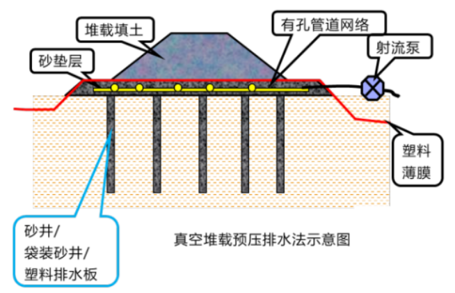砂井堆载预压法是一种常用的软土地基处理方法,其原理是利用挖掘机将一定直径的砂井堆载在软土地基上,然后进行振动或压实,以提高地基的承载力和稳定性。