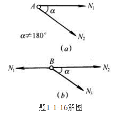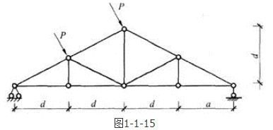 答案解析: 零杆判别方法包括:①两杆节点A上无荷载作用时(题1-1-16解图(a)),则该两杆的内力都等于零,N1=N2=0。②三杆节点B上无荷载作用时(题1-1-16解图(b)),如果其中有两杆在一直线上,则另一杆必为零杆,N3=0。根据零杆判别方法包括法可知,左、右两个竖杆和右边的斜杆为零杆。
