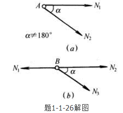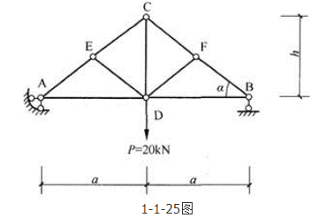 答案解析: 零杆判别方法包括:①两杆节点A上无荷载作用时(图题1-1-26解图a),则该两杆的内力都等于零,N1=N2=0。②三杆节点B上无荷载作用时(题1-1-26解图b),如果其中有两杆在一直线上,则另一杆必为零杆,N3=0。用桁架中的零杆判别方法包括法考虑节点F,可知DF杆为零杆,NDF=0。