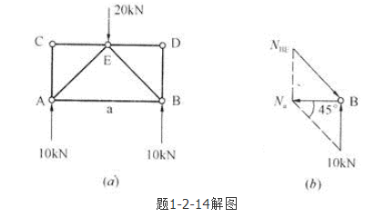 kN(压力),在解图(b)中取B节点为隔离体,根据图(b)中的三角形比例关系可知Na=10kN(拉力)。