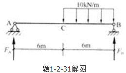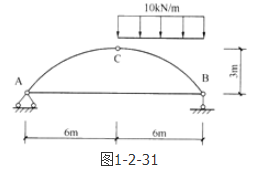 答案解析: 首先画出图示带拉杆的三铰拱相应的简支梁,如解图所示。取整体为研究对象,先求支座反力,设支座反力竖直向上。由平衡方程,即得到FA=15kN。由整体水平方向受力平衡,可得A水平支座反力为零。中点弯矩值=FA×6=90kN·m,则可得原三铰拱的水平杆AB中的轴力:。