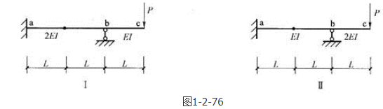 答案解析: 图示结构为一次超静定结构,利用力法求位移,可以求出Ⅰ图的挠度小于Ⅱ图的挠度。超静定结构各部分的弯矩分配与各部分的刚度比有关,但是单跨超静定结构的弯矩与本身的刚度大小无关。本题中bc跨是静定结构,ab跨是单跨超静定梁,跨中弯矩与自身刚度无关,故MⅠ=MⅡ。但由于I图ab跨刚度大于I图,因此挠度ΔⅠ<ΔⅡ。