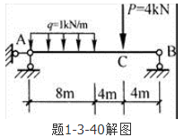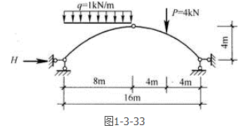 答案解析: 三铰拱的求解可以当做简支梁的求解然后带入特定的公式。图示三铰拱的相应简支梁如题1-3-40解图所示。由平衡方程∑MA=0,可求出B点的支座反力FB=5kN,则=5×8-4×4=24kN·m。根据公式三铰拱的水平推力H==6kN。