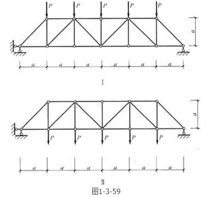 答案解析: 图示结构I、Ⅱ中竖腹杆受力显然不同。例如中间一根竖腹杆,Ⅰ图中受力为﹣P,而Ⅱ图中受力为零。在分析弦杆受力时,应用截面法,能够很容易得到图Ⅰ、Ⅱ中虽然P的作用位置发生变化,但是弦杆受力并不受影响。同理可得Ⅰ、Ⅱ斜腹杆受力也完全相同。