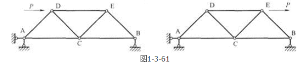 答案解析: 图示两种不同荷载大小、方向、作用线相同,所以产生的支座A、B的反力也相同,根据A、B两点的受力平衡,可以得到AC、AD、BC、BE四杆的受力也相同。再由节点C计算的CD、CE两杆的内力也是相同的。区别仅为DE杆受力发生变化,左图中DE杆受压,由图中DE杆受拉。