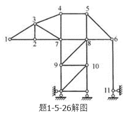 答案解析: 如右图所示,按照1、2、3、4、5、6、7、8、9、10、11的顺序依次去掉二元体,得到一个简支梁,为静定结构,所以结构为无多余约束的几何不变体系。
