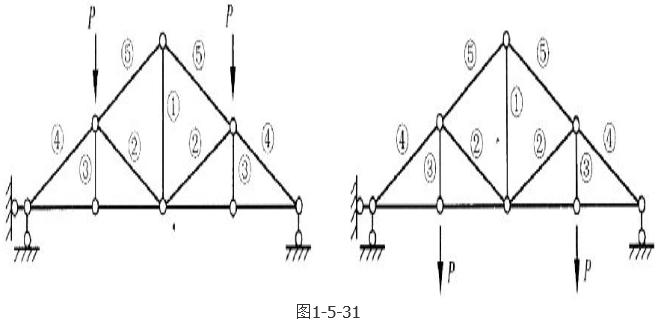 答案解析: 零杆的判别方法包括:①两杆节点A上无荷载作用时,则该两杆的内力都等于零,N1=N2=0;②三杆节点B上无荷载作用时,如果其中有两杆在一直线上,则另一杆必为零杆,N3=0。根据零杆判别方法可知,当P力作用在上面时③杆是零杆,当P力作用在下面时③杆受拉力P,而其他各杆根据静力平衡方程可知各杆的受力情况不变。