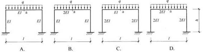 答案解析: 图示刚架均为超静定结构,由力矩分配法可知横梁与竖杆的刚度比越大,分配系数就越大,则其弯矩值也越大。