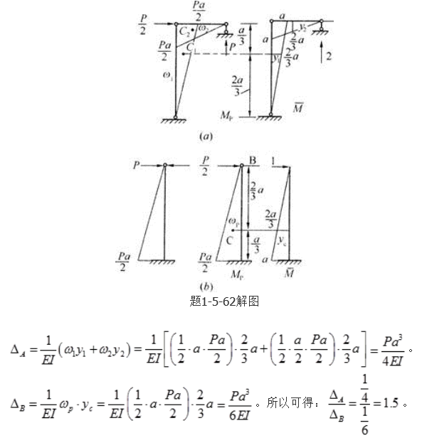答案解析: 用单位荷载法,A点所在结构为对称结构,受反对称荷载,可简化为(a)图。B点所在结构为一次超静定排架,可简化为(b)图。然后分别用图乘法计算,图乘可得: