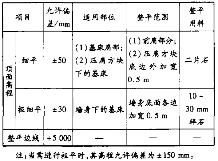 答案解析: 抛石基床的整平可分为粗平、细平和极细平。大型构件底面尺寸大于或等于30m2时其基床可不进行极细平。基床整平偏差应符合下表的规定。