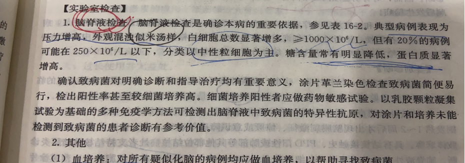 【知识拓展】确认致病菌对明确化脓性脑膜炎的诊断和指导治疗均有重要意义,涂片革兰染色检查致病菌简便易行,检出阳性率甚至较细菌培养高。细菌培养阳性者应做药物敏感试验。以乳胶颗粒凝集试验为基础的多种免疫学方法可检测出脑脊液中致病菌的特异性抗原,对涂片和培养未能检测到致病菌的患者诊断有参考价值。