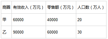 答案解析: 本题考查购买力指数的计算。甲商圈的购买力指数BPI=0.2×(20/50)+0.3×(40000/100000)+0.5×(60000/150000)=0.4。