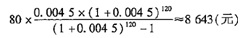 答案解析: 本题考查个人住房贷款的有关计算。等额本息还款方式的月还款额等于以贷款金额为现值计算的年金,计算公式为: 。本题中,i=5.4%÷12=0.0045,n=10×12=120,则A= 。
