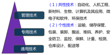 本题考查流通技术层次。 1.流通通用技术:(1)标准化技术;(2)质量保证技术;(3)信息技术。 2.流通专用技术:(1)共性技术:自动化、人机工程、新材料、生物、计算机及其应用、微电子和软件、环保技术。(2)个性技术:运输、储存保管、包装、装卸、搬运、堆码、养护、安全防卫、监控、保鲜、计量、检测、仓库设计、配送等。 3.流通管理技术:(1)宏观管理技术:优化、系统工程、质量管理等。(2)微观管理技术:办公自动化、管理信息系统、资金管理、人事管理等。
