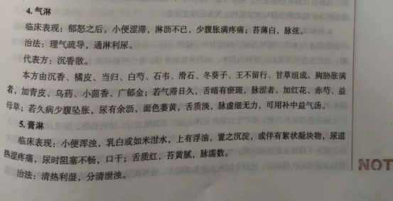 【知识拓展】淋证的治疗原则:实则清利,虚则补益,是治疗淋证的基本原则。实证有膀胱湿热者,治宜清热利湿;有热邪灼伤血络者,治宜凉血止血;有砂石结聚者,治宜通淋排石;有气滞不利者,治宜利气疏导。虚证以脾虚为主者,治宜健脾益气;以肾虚为主者,治宜补虚益肾。所以徐灵胎评《临证指南医案·淋浊》时指出:“治淋之法,有通有塞,要当分别,有瘀血积塞住溺管者,宜先通,无瘀积而虚滑者,宜峻补。”淋证的治法,古有忌汗、忌补之说,如《金匮要略·消渴小便不利淋病脉证并治》说:“淋家不可发汗”,《丹溪心法·淋》说:“最不可用补气之药,气得补而愈胀,血得补而愈涩,热得补而愈盛。”验之临床实际,未必都是如此。淋证往往有恶寒发热,此并非外邪袭表,而是湿热熏蒸,邪正相搏所致,发汗解表,自非所宜。因淋证多属膀胱有热,阴液常感不足,而辛散发表,用之不当,不仅不能退热,反有劫伤营阴之弊。若淋证确由外感诱发,或淋家新感外邪,症见恶寒发热,鼻塞流涕,咳嗽,咽痛者,仍可适当配合辛凉解表之剂。因淋证为膀胱有热,阴液不足,即使感受寒邪,亦容易化热,故应避免辛温之品。至于淋证忌补之说,是指实热之证而言,诸如脾虚中气下陷,肾虚下元不固,自当运用健脾益气,补肾固涩等法治之,不属忌补范围。